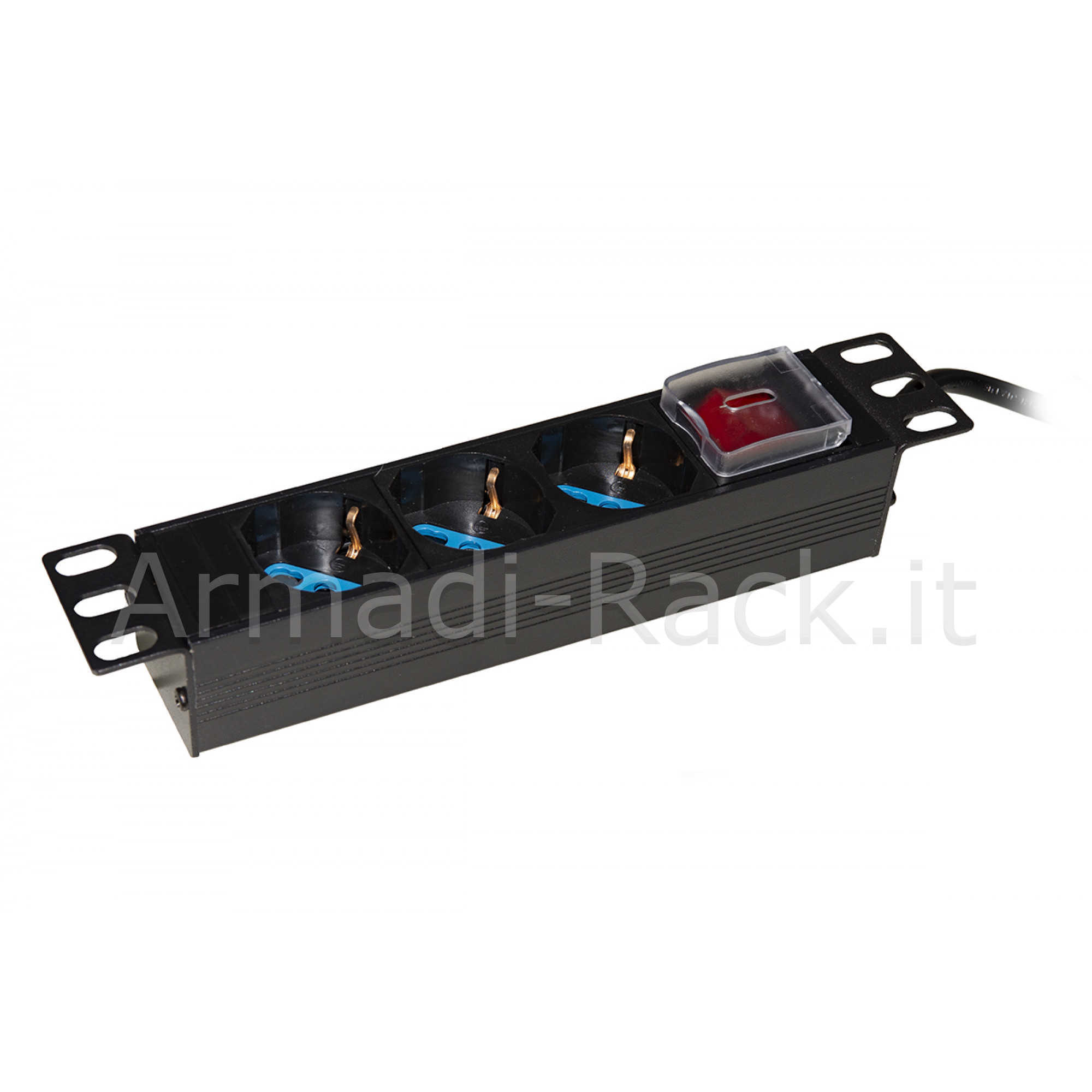PRESA MULTIPLA PER ARMADI RACK 10'' CON INTERRUTTORE LUMINOSO.Multipresa per armadi rack 10'' con 3 prese miste italiane/tedesche schuko.Per alimentare i dispositivi all'interno degli armadi rack, si attacca ai montanti laterali 10 pollici con le staffe incluse (reversibili).Il particolare coperchio di protezione dell'interruttore apribile e richiudibile con cerniera impedisce lo spegnimento accidentale della multipresa, senza bisogno di rimuovere il coperchietto tutte le volte che si deve accendere e spegnere la multipresa.Con 3 prese universali Schuko tedesche CEE 7/7 e italiane tripolari UNEL 2P+T 16A femmina disposte a 35 gradi e una spina italiana tripolare 16 ampere maschio.La disposizione delle prese a 35° permette il collegamento dei cavi spina tedesca a 90° Specifiche cavo H05VV-F, sezione 1,5 mm Occupa 1 Unità.250Volt 3500Watt.Lunghezza cavo mt.1,75