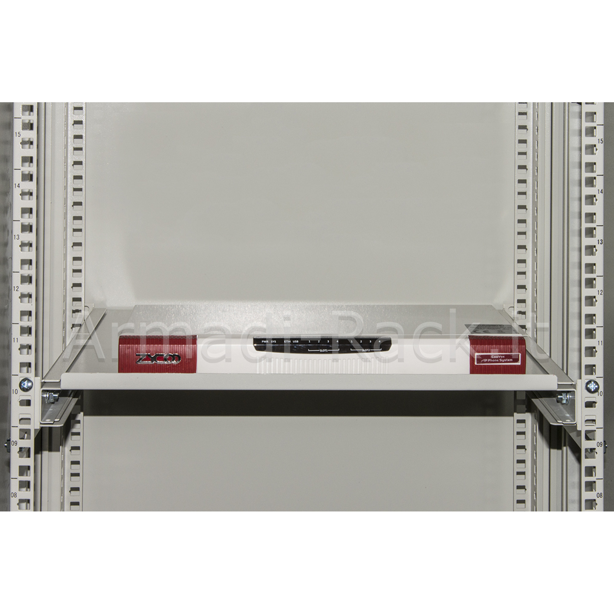 Ripiani in acciaio, per sostenere i componenti di rete degli armadi rack.