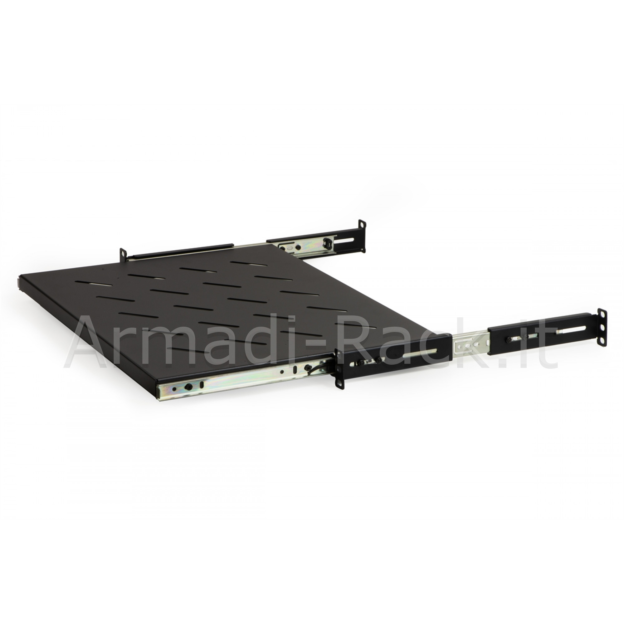 Mensole estraibili in acciaio per armadi rack.Di costruzione solida, con 4 agganci, si attaccano ai montanti laterali anteriori e posteriori nell'armadio rack 19".Le viti per l'installazione sono incluse.I ripiani sono traforati per agevolare il passaggio dell'aria e diminuire il surriscaldamento all'interno dell'armadio.Distanza minima tra i montanti 35cm.La distanza tra i montanti è regolabile, si può allungare di altri 5 cm.Tipicamente questi ripiani vanno su armadi profondi circa 600 mm.Il ripiano si può estrarre di 23,5 cm.Capacità di carico 40 Kg.La mensola è universale, quindi si può usare su tutti i tipi di armadi anche di altre marche, compatibilmente con la profondità.Con rialzo posteriore per bloccare i dispositivi sostenuti e con incavo anteriore per agevolare la presa e l'estrazione del ripiano.Colore nero RAL9005.