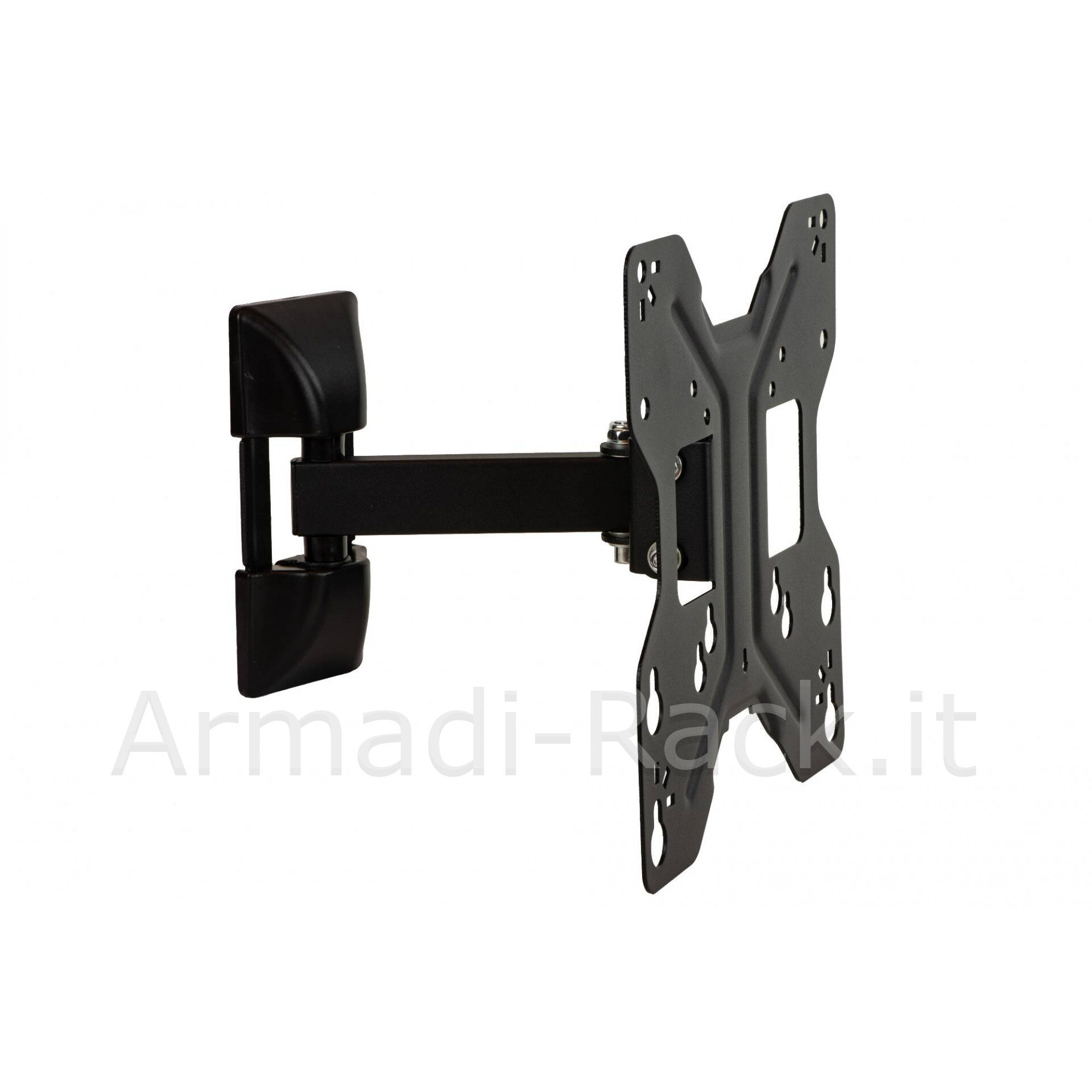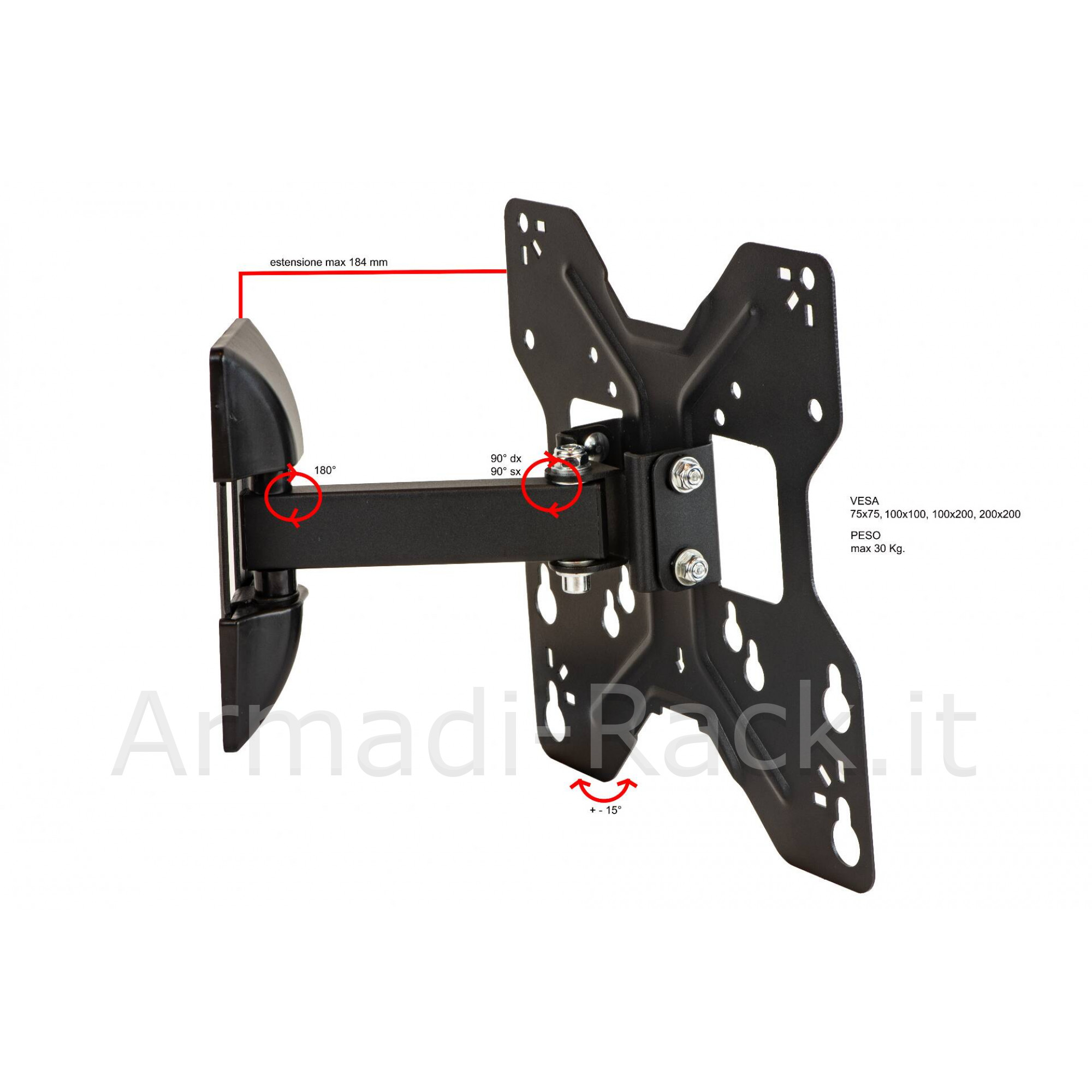 BRACCIO SUPPORTO A MURO A 2 SNODI PER SCHERMI 23-42 FINO A 30 KG Supporta fino a 30 kg. Installazione semplice e veloce. Regolabile sia in orizzontale sia in verticale, permette di posizionare la TV nella posizione desiderata. Gli snodi permettono di orientare il video a seconda dell'angolo di visione desiderato, quindi si adatta a qualsiasi ambiente permettendo di scegliere con la massima liberta' la posizione di installazione. E' la soluzione per chi vuole installare la TV o un monitor in modo sicuro, semplice e veloce. La clip per ordinare i cavi permette di tenerli ordinati e protetti. In acciaio, offre un'ottima resistenza. Dimensioni del tubo di supporto: 30x15x1.2mm Dimensioni del prodotto: 184x230x240mm Per video: 23-42 Per standard VESA: 75x75, 100x100, 200x100, 200x200 Orientamento verticale: +15°~-15° Orientamento orizzontale: +90°~-90° Si estende dal muro da: 4 a -184mm. Viti e tasselli inclusi.