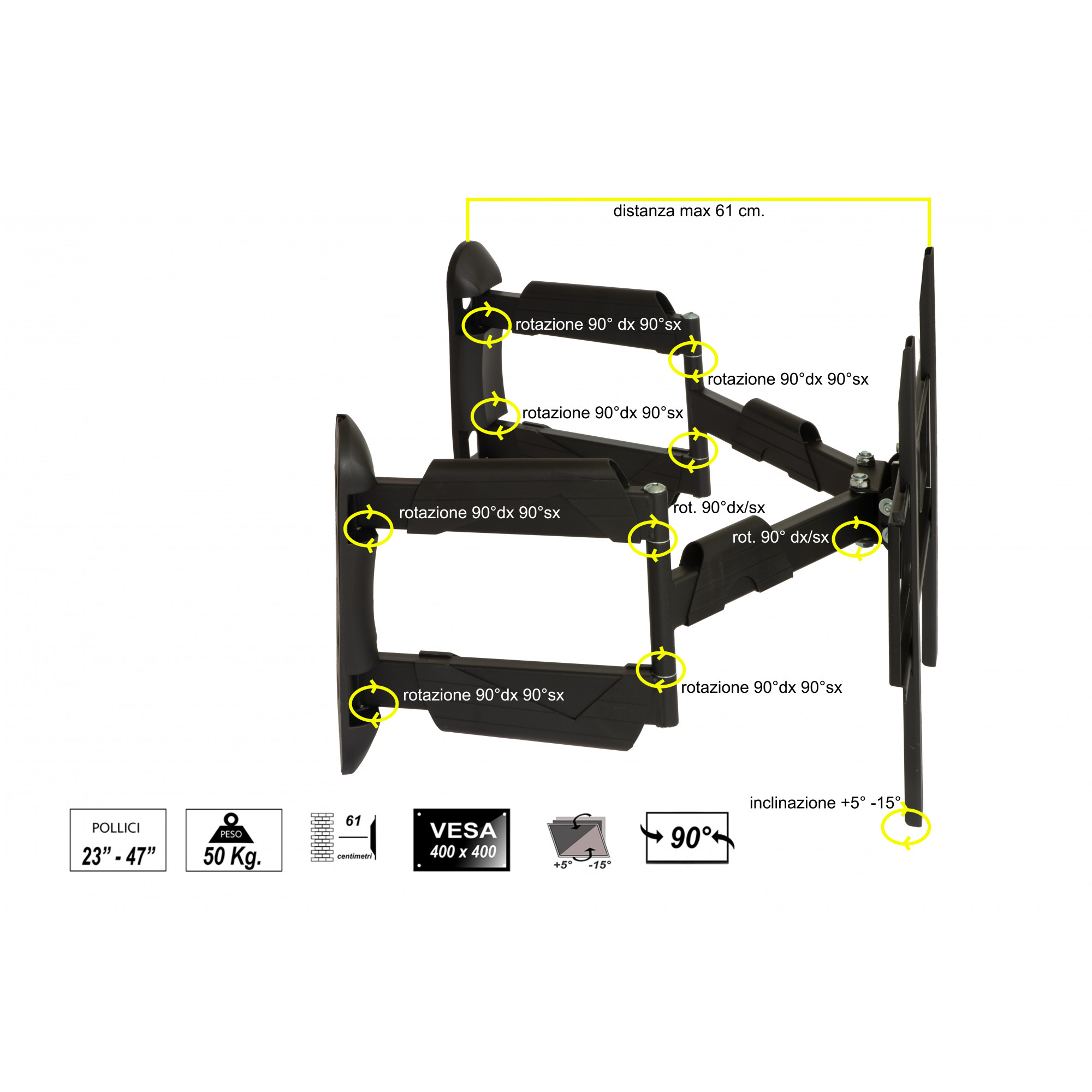 Staffa per installare a parete monitor e TV LED o LCD da 23" a 47", con possibilità di regolare l'angolo di visione verticale e orizzontale, anche in lunghezza.