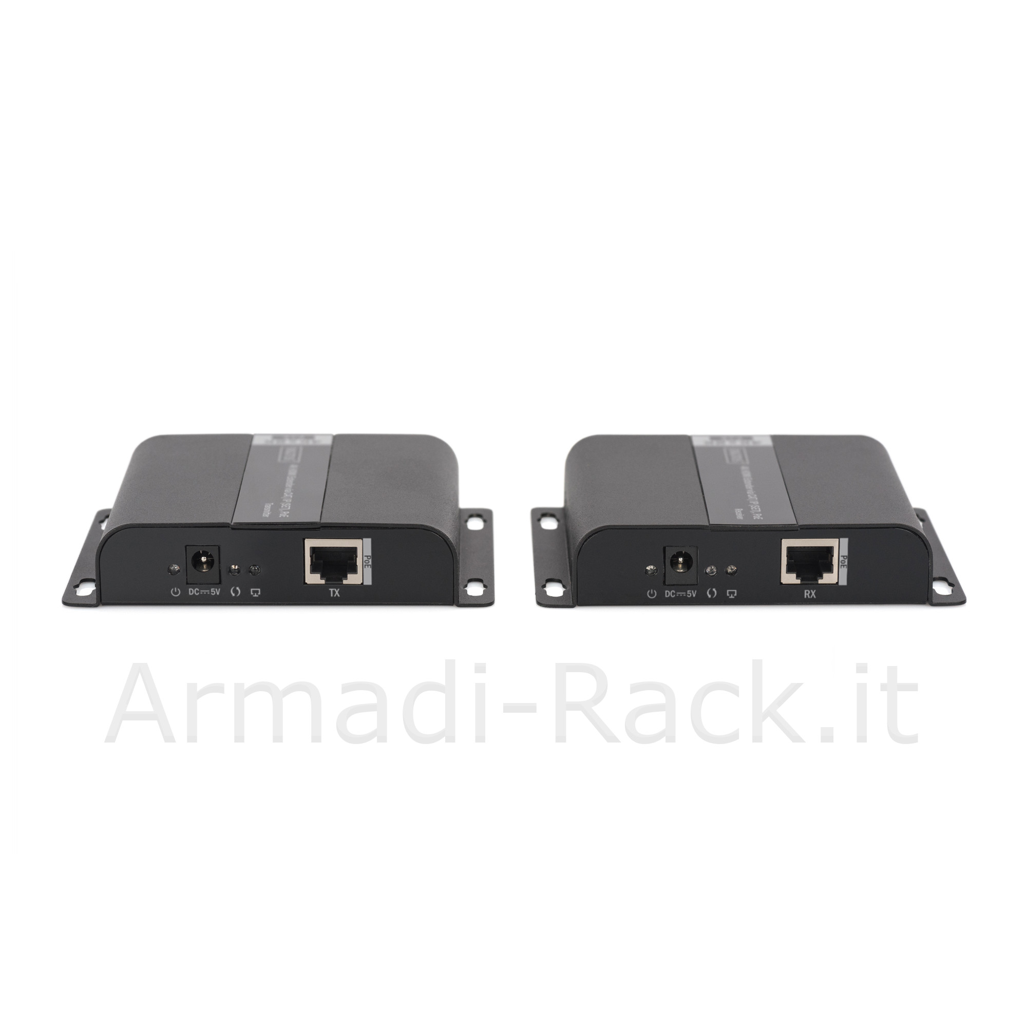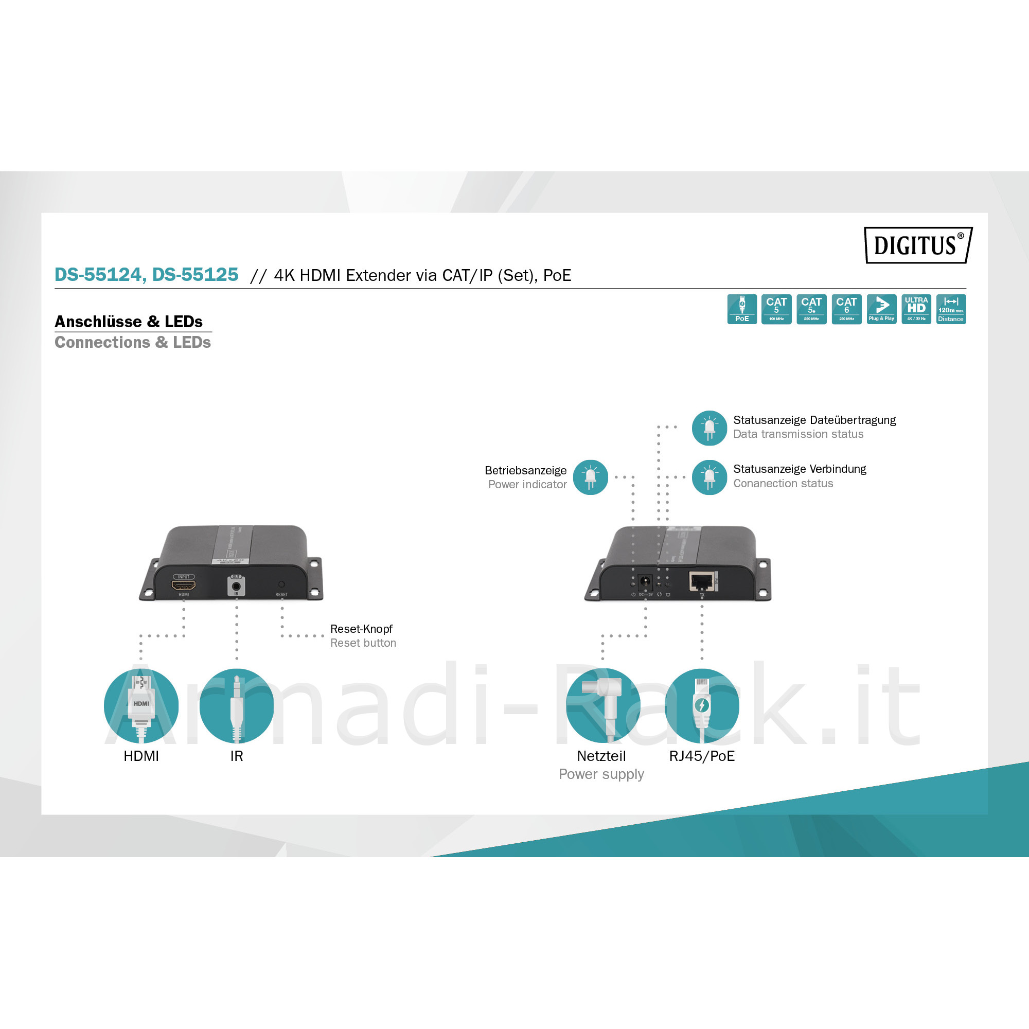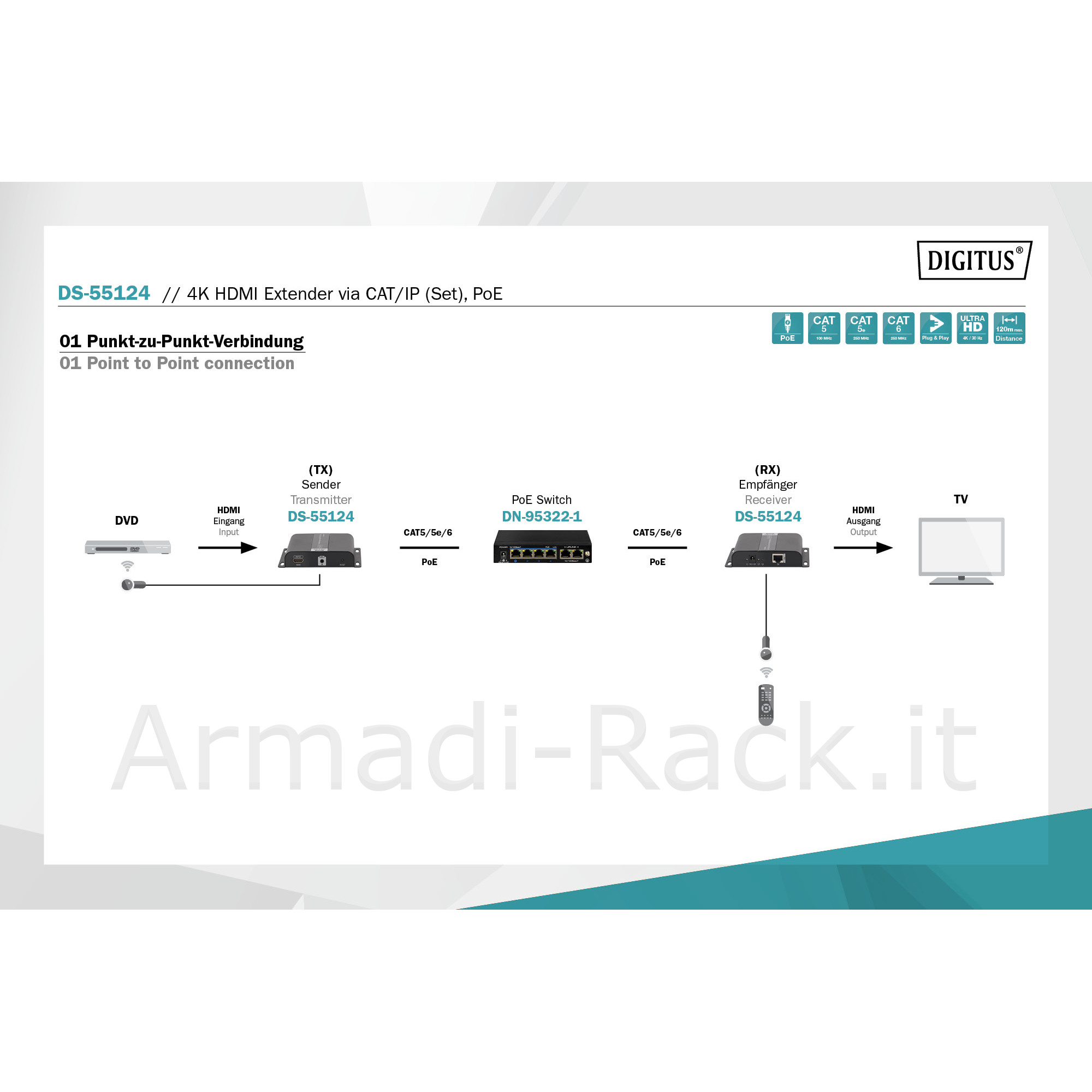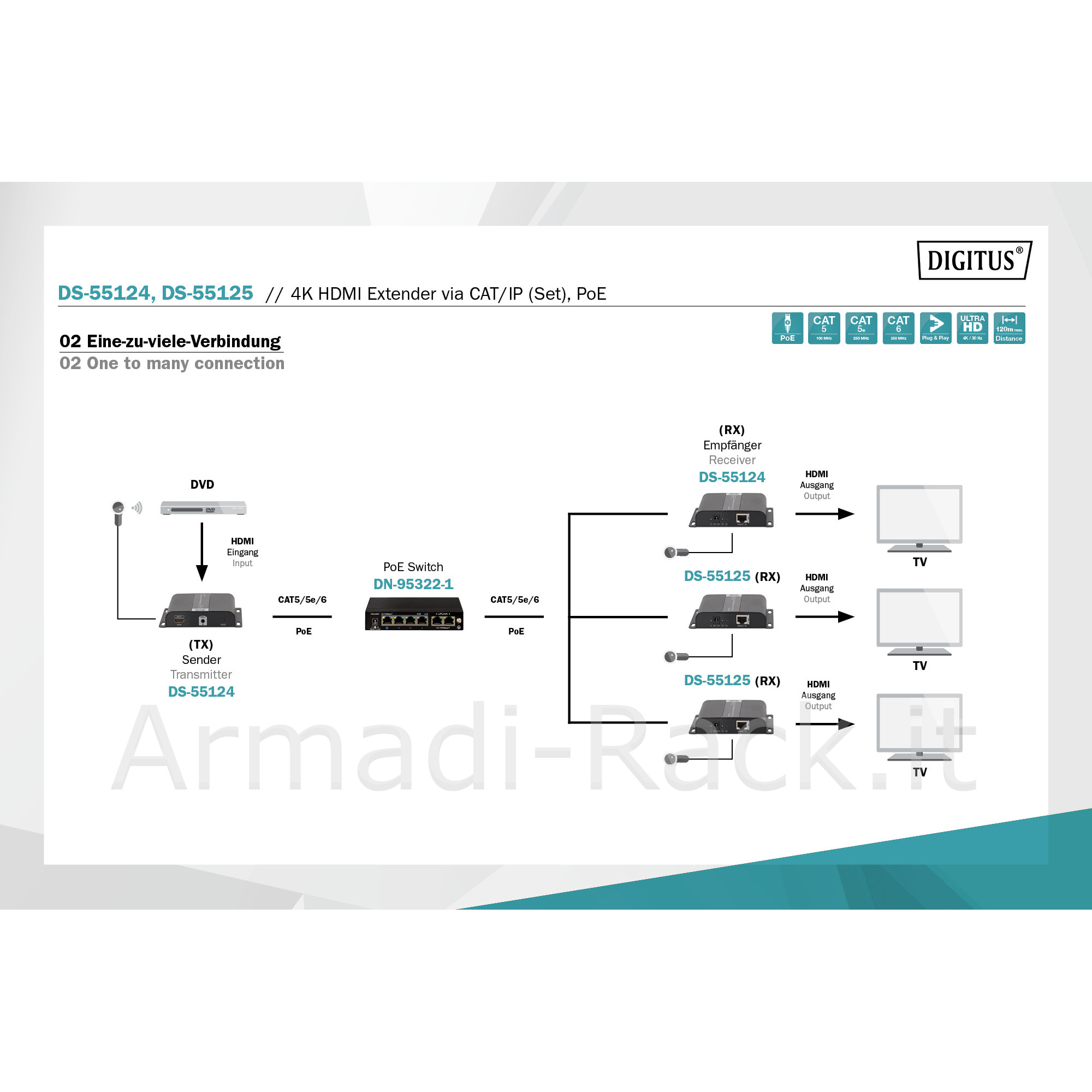Il set di estensione HDMI 4K (DS-55124) è costituito da un'unità ricetrasmittente. Entrambi non richiedono alimentatori esterni, l'alimentazione è fornita da uno switch PoE aggiuntivo. Quando si utilizzano switch PoE aggiuntivi o l'infrastruttura esistente, il segnale HDMI può essere esteso ad una distanza illimitata (connessione IP). Utilizzando ricevitori aggiuntivi (DS-55125), il contenuto video può essere distribuito fino a 253 schermi utilizzando l'infrastruttura di rete esistente o switch PoE aggiuntivi (connessione punto-multipunto). Con una semplice connessione punto a punto, il contenuto video 4K può essere visualizzato fino a 120 metri di distanza. Posizionate i vostri schermi, televisore in modo flessibile in qualsiasi luogo, indipendentemente dalla sorgente di uscita.