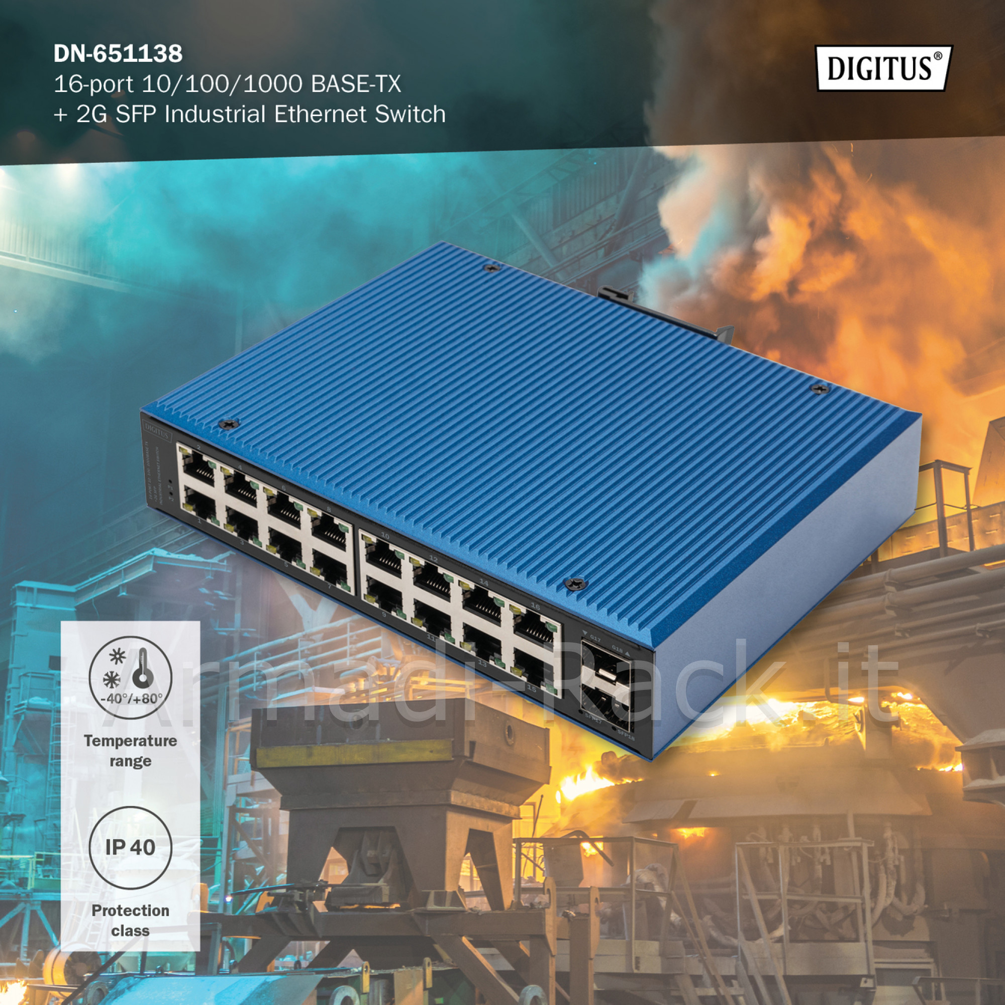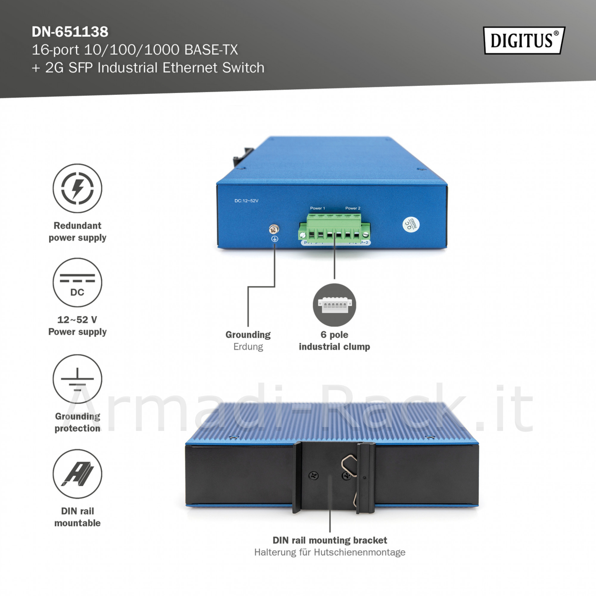 Digitus switch di rete gigabit ethernet a 16 porte, industriale, non gestito, 2 uplink sfp