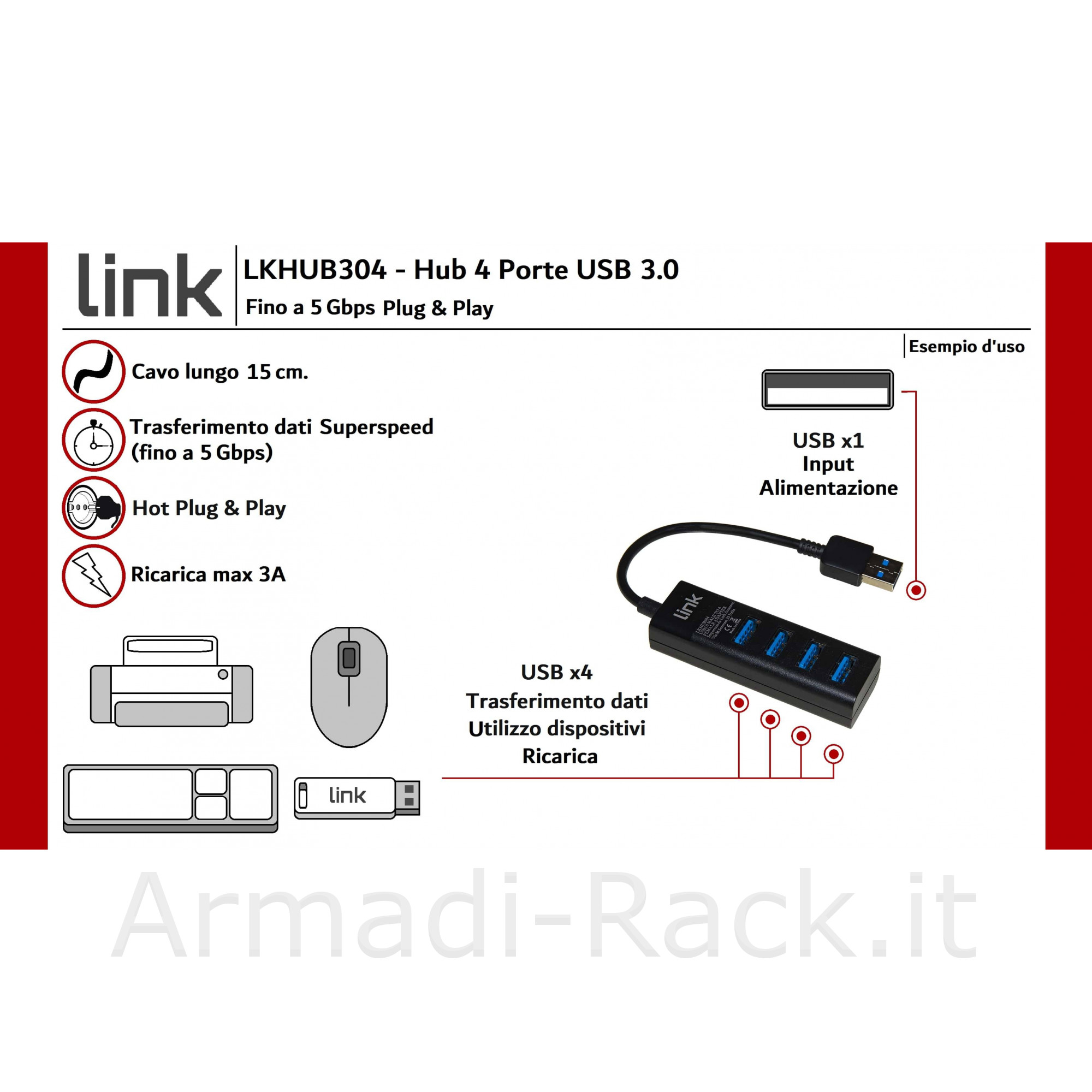 Trasferimento dati fino a 5 Gbps e alimentazione max 3A per ricarica dispositivi.