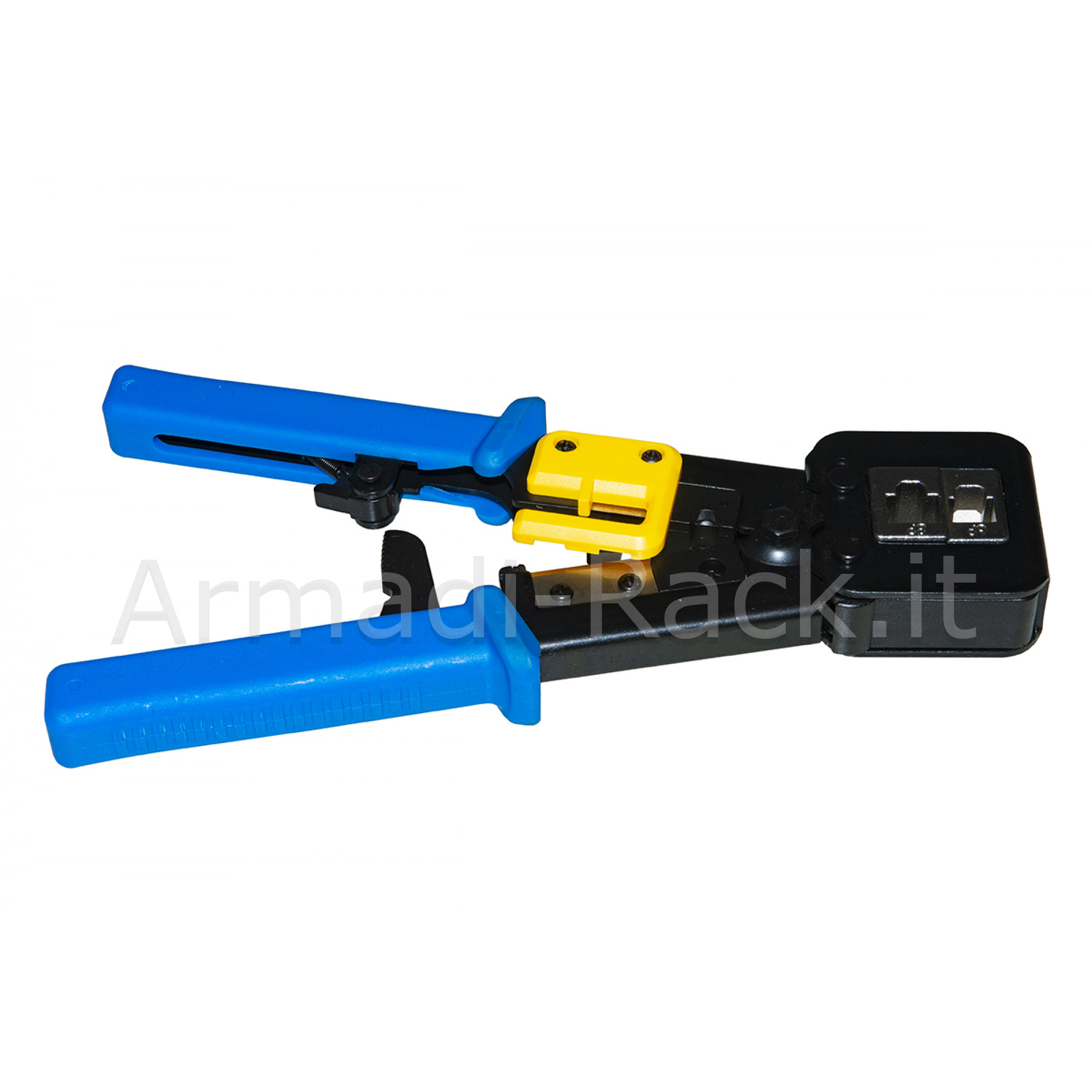Pinza universale per intestare i connettori da 6 poli (4 e 6 conduttori) e RJ45 8 poli, sia schermati che non schermati, sul cavo piatto o rotondo, ad esempio il cavo di rete.