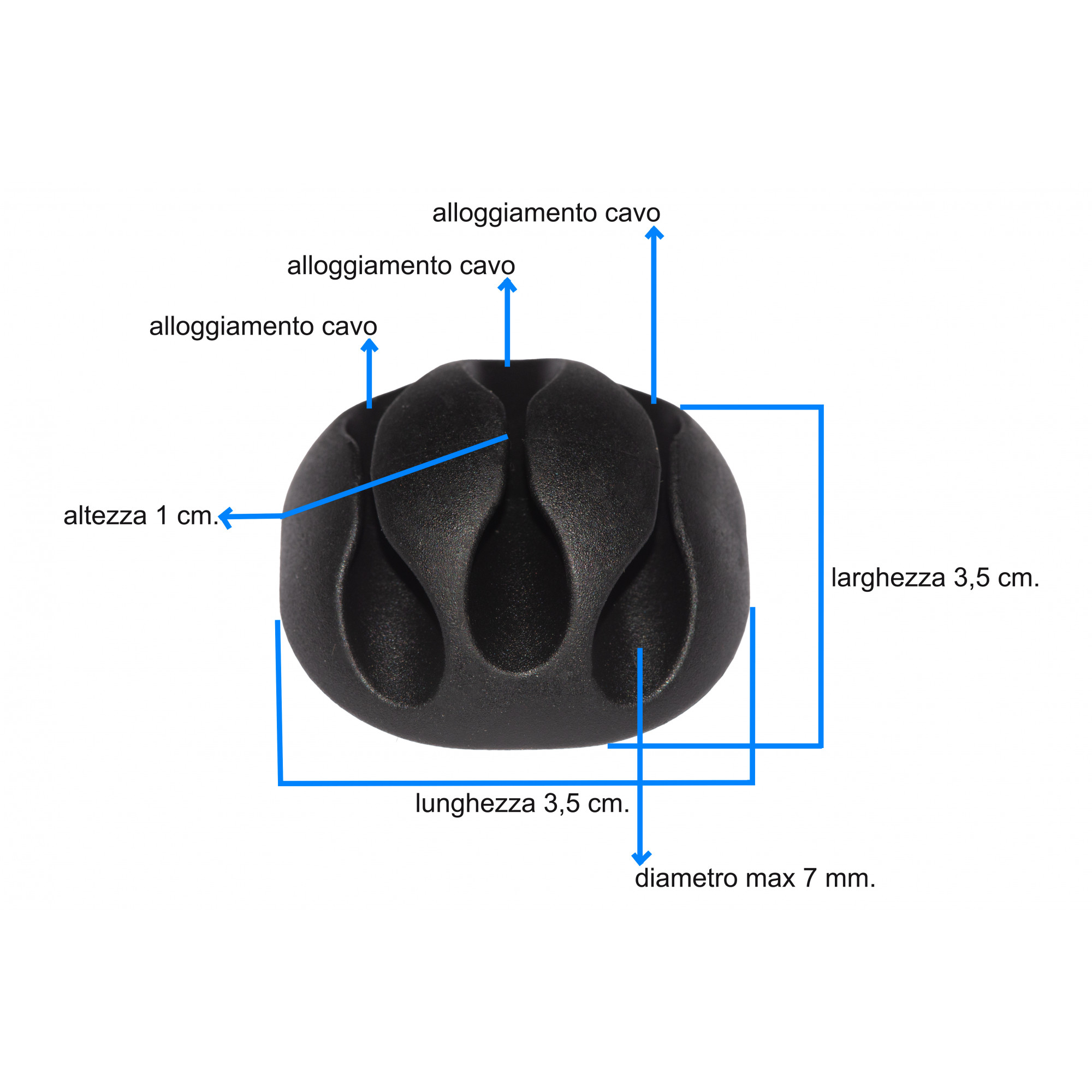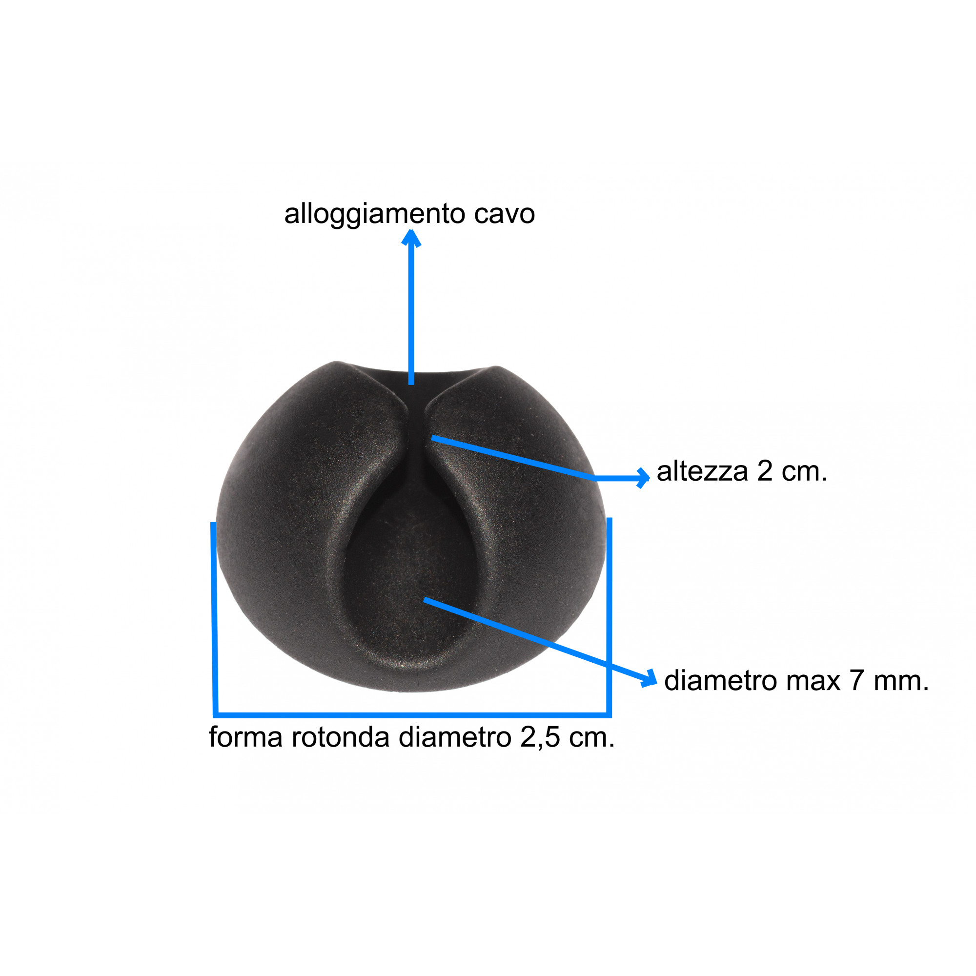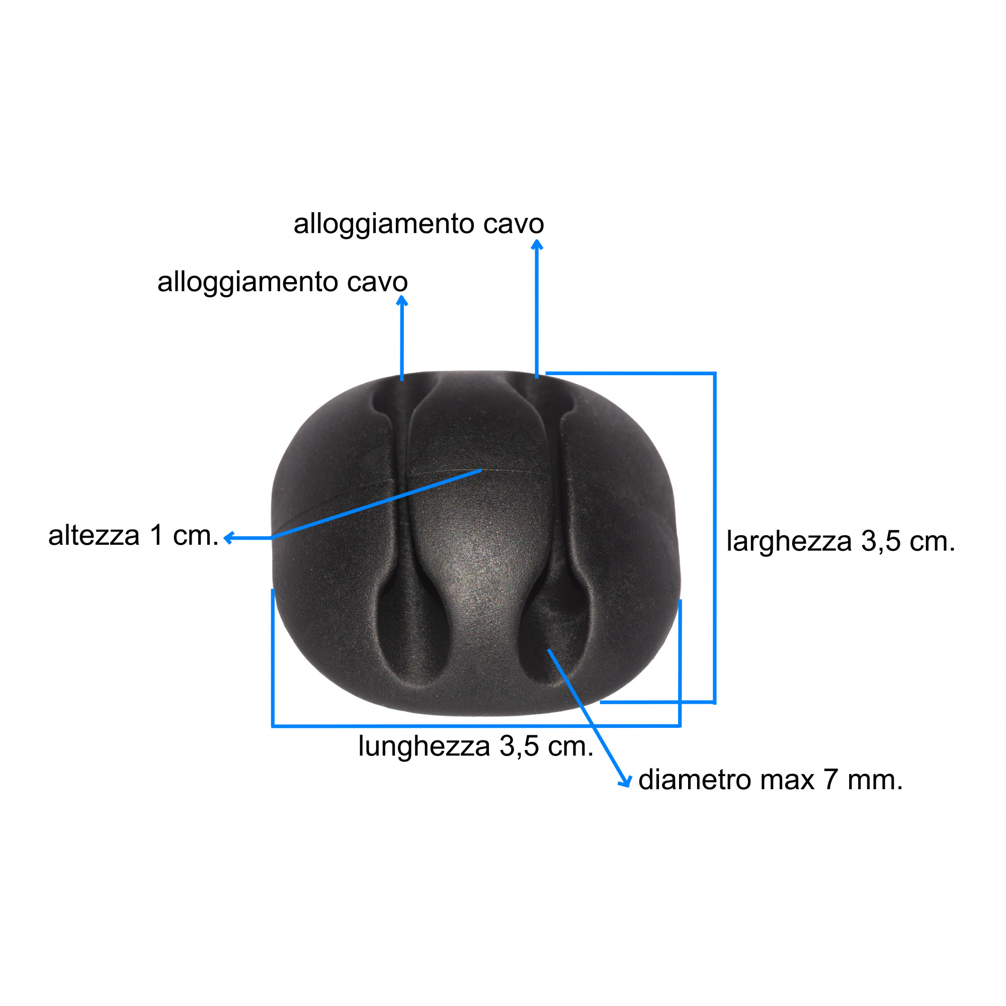 Supporti adesivi per gestire i cavi, per esempio i cavi di ricarica per lo smartphone, i cavi video della TV, o i cavi della stampanteSono piccoli e si possono installare in modo discreto in comodini, sotto i tavoli, sui mobiliRende più semplice prendere il cavo, e rendono più ordinato l'ambienteIn materiale TPR flessibileKit da 16 pezzi:6 supporto singolo cavo diametro cm 2.5 altezza 2 cm4 supporti per 2 cavi diametro cm 2.5 altezza 2 cm2 supporti per 2 cavi cm 3.5x3.5 altezza 1 cm2 supporti per 3 cavi cm 3.5x3.5 altezza 1 cm2 supporti per 5 cavi cm 6.5x2.8, altezza 1 cmOgni supporto permette di alloggiare cavi fino a 7 mm di diametro.