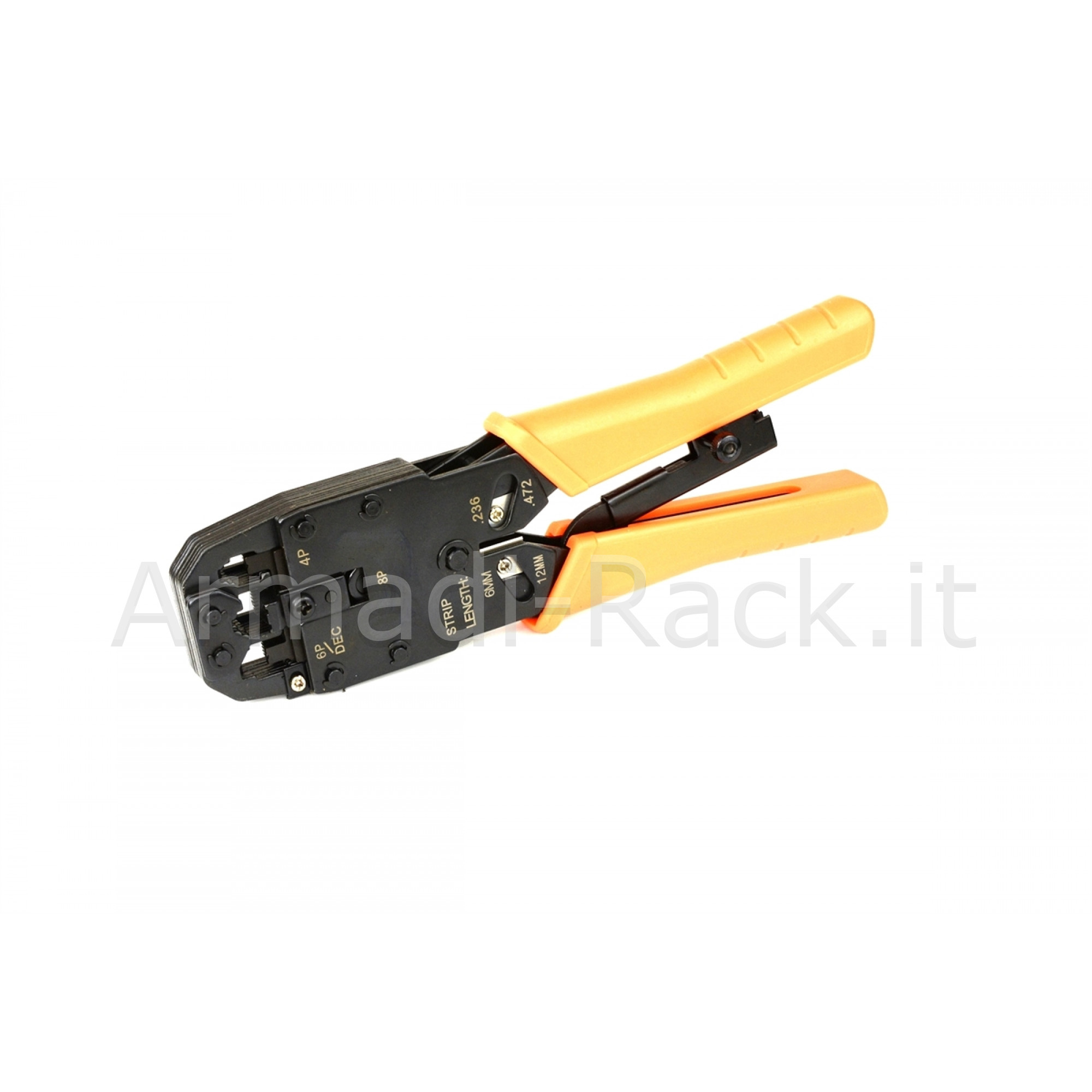 Pinza universale per intestare i connettori da 4, 6, 8 poli, sia schermati che non schermati, sul cavo piatto o rotondo, ad esempio il cavo di rete.