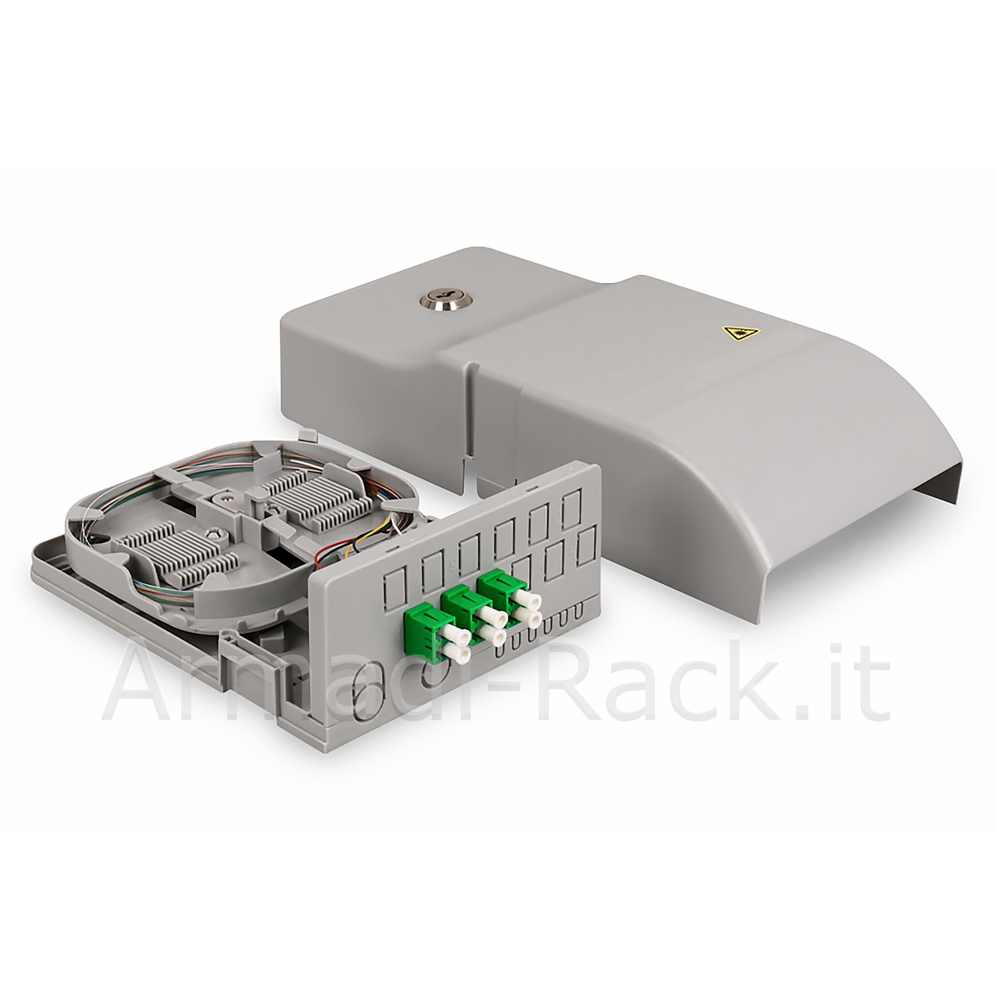 DescrizioneL'unità di distribuzione è assemblata tramite un alloggiamento in 3 parti.La piastra di base viene fissata nel punto desiderato e garantisce così un lavoro libero nel distributore.Grazie all'intelligente guidacavo il cavo può essere posato e fissato senza difficoltà.La piastra di base dispone inoltre di un supporto per splitter PLC e di varie opzioni di ingresso cavi.Due ritagli sulla piastra di base consentono l'inserimento di microdotti da 7 mm o 12 mm.La presa sulla piastra di base offre spazio per una presa di giunzione, che può essere sostituita da qualsiasi presa di giunzione o termoretraibile.Lo spazio della piastra inferiore e del supporto per crimpatura può essere utilizzato per una giunzione passante.Il secondo accessorio contiene la versatile cassetta di giunzione, che può ospitare fino a 12 accoppiamenti, fornendo spazio per 24 fibre.I dodici fori possono essere dotati di un massimo di 12 accoppiatori LC duplex, 12 SC simplex o 12 accoppiatori E-2000®.Le due prese nella cassetta di giunzione sono occupate da due portagiunti a crimpare per dodici fibre ciascuno.Questi possono essere sostituiti con dispositivi di giunzione o termoretraibili standard.Infine, la wallbox è protetta da un lungo coperchio, che impedisce l'accesso da parte dell'abbonato.Il coperchio può essere bloccato anche tramite la serratura a cilindro integrata.Lateralmente è presente un dispositivo per sigillare la scatola di giunzione.Dettagli tecnici Tre prese a testa flessibile con prese di giunzione per la protezione della giunzione a crimpare Ingresso del cavo patch protetto da una lunga copertura Presa divisore PLC Chiudibile tramite serratura integrata Guida della fibra ''stressless'' ottimizzata per il raggio di curvatura Adatto per il montaggio a parete Materiale: plastica (ABS) 2 ingressi per microdotti da 7/12mm Può ospitare fino a 2 blocca gas Pigtail: montati, disattivati, codificati a colori secondo IEC 60304 e conservati nella cassetta Capacità: 3 duplex LC Cassetta di giunzione rimovibile con memoria di lunghezza eccessiva del pigtail Dimensioni (AxLxP): 256 x 122 x 59 mm Temperatura di funzionamento: -25/+70° C Temperatura di stoccaggio: -40/+90° C IL: massimo 0,20 dB1.2 RL: min.60dB1.3Contenuto della confezione Ftth Home Distribution Unit (tecnologia della linea di terminazione) con giunti, grigio chiaro 3 giunti LC/APC DX-SM, custodia in plastica verde con manicotto in ceramica 6 x pigtail LC/APC-SX E9/125µm G657A1 OS2 - Serratura a cilindro da 1,5 m con 2 chiavi 3 ancoraggi con viti abbinate