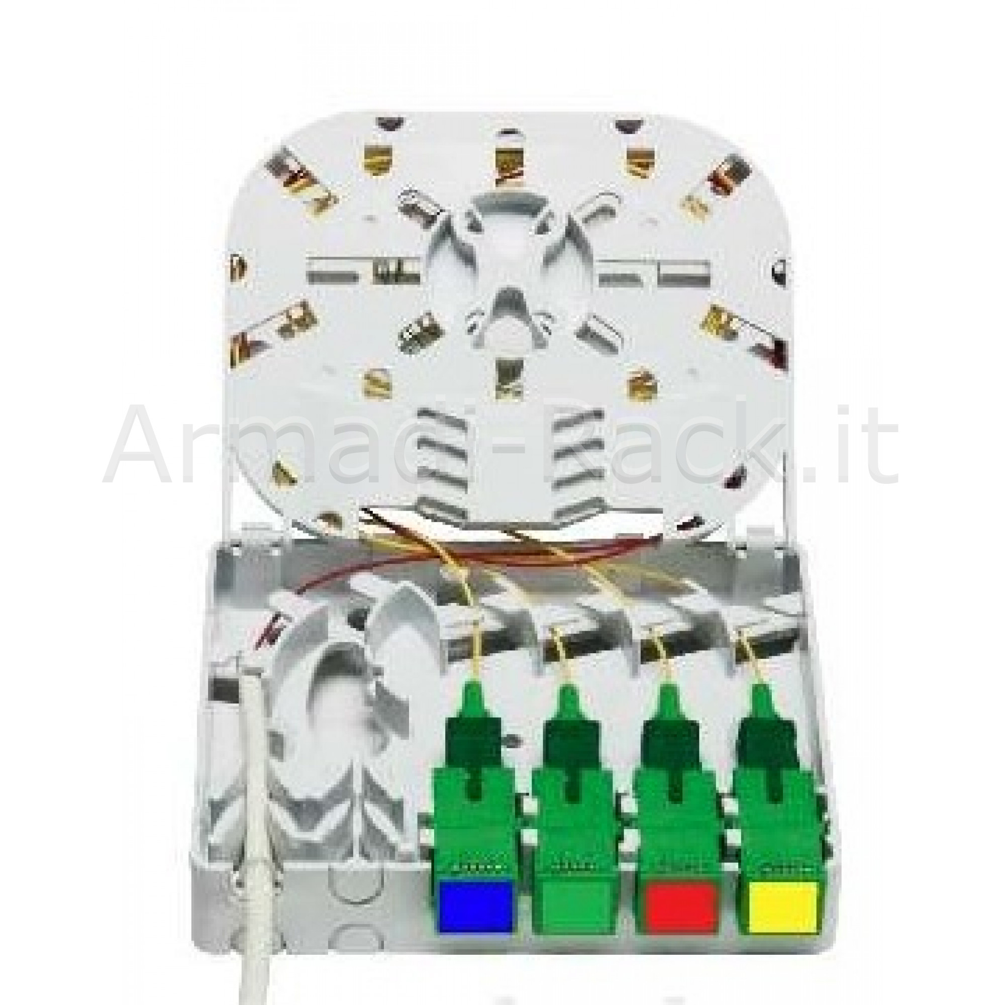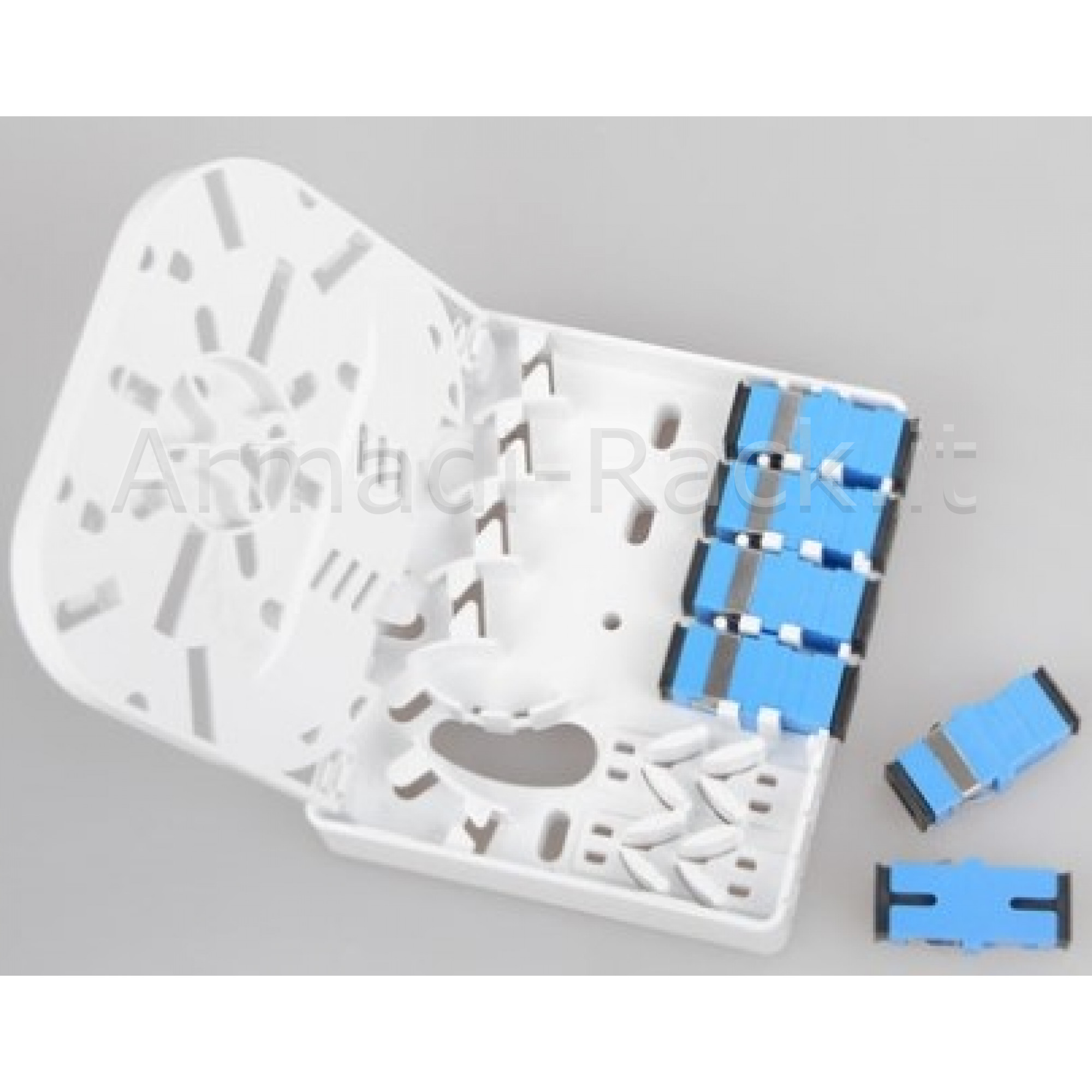 Box per connettori fibra ottica SC simplex o LC, senza flangia (flangeless) Anche per applicazioni FTTH Con supporto passacavi interno.Tasselli per il fissaggio a muro inclusi.Con 4 posizioni per il passaggio cavi dietro, davanti o da sotto.Con sportello removibile per maggiore capacità di uso.Misure cm 8,5x10x3