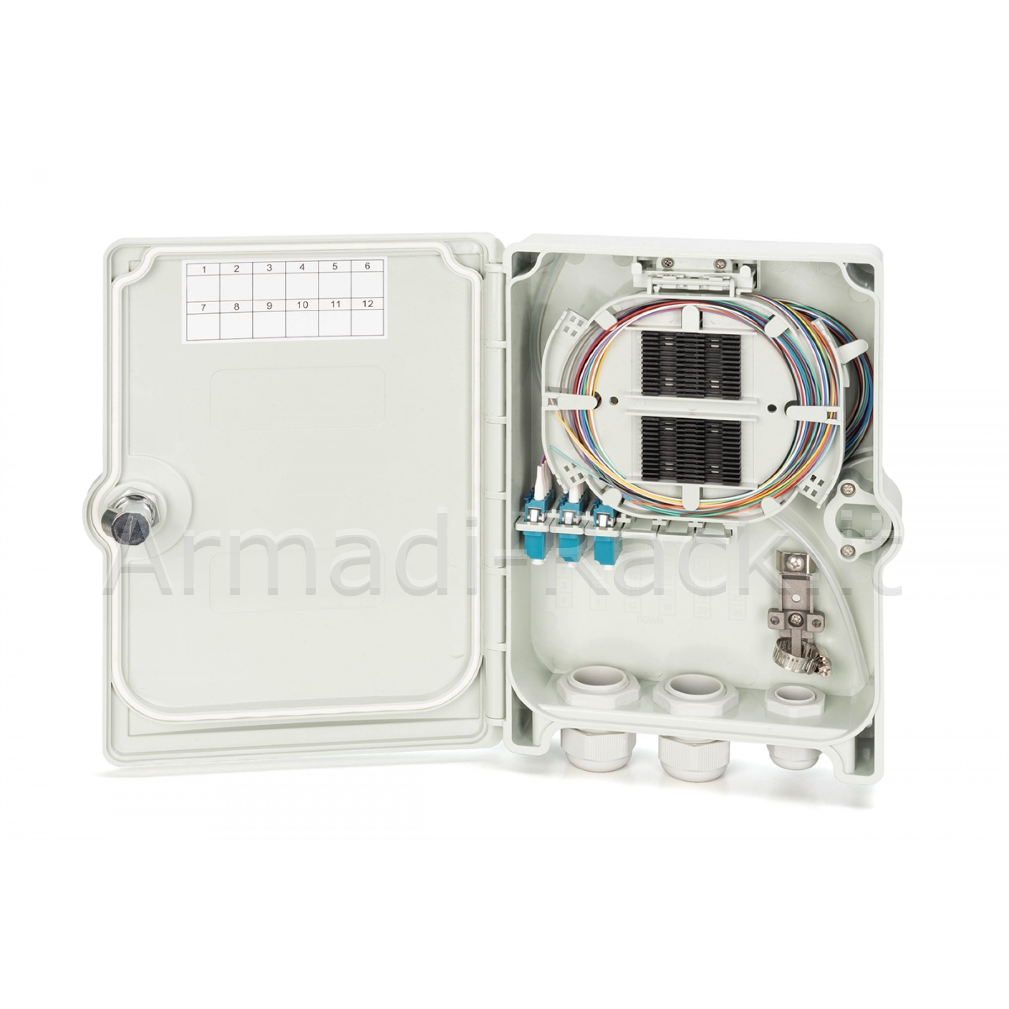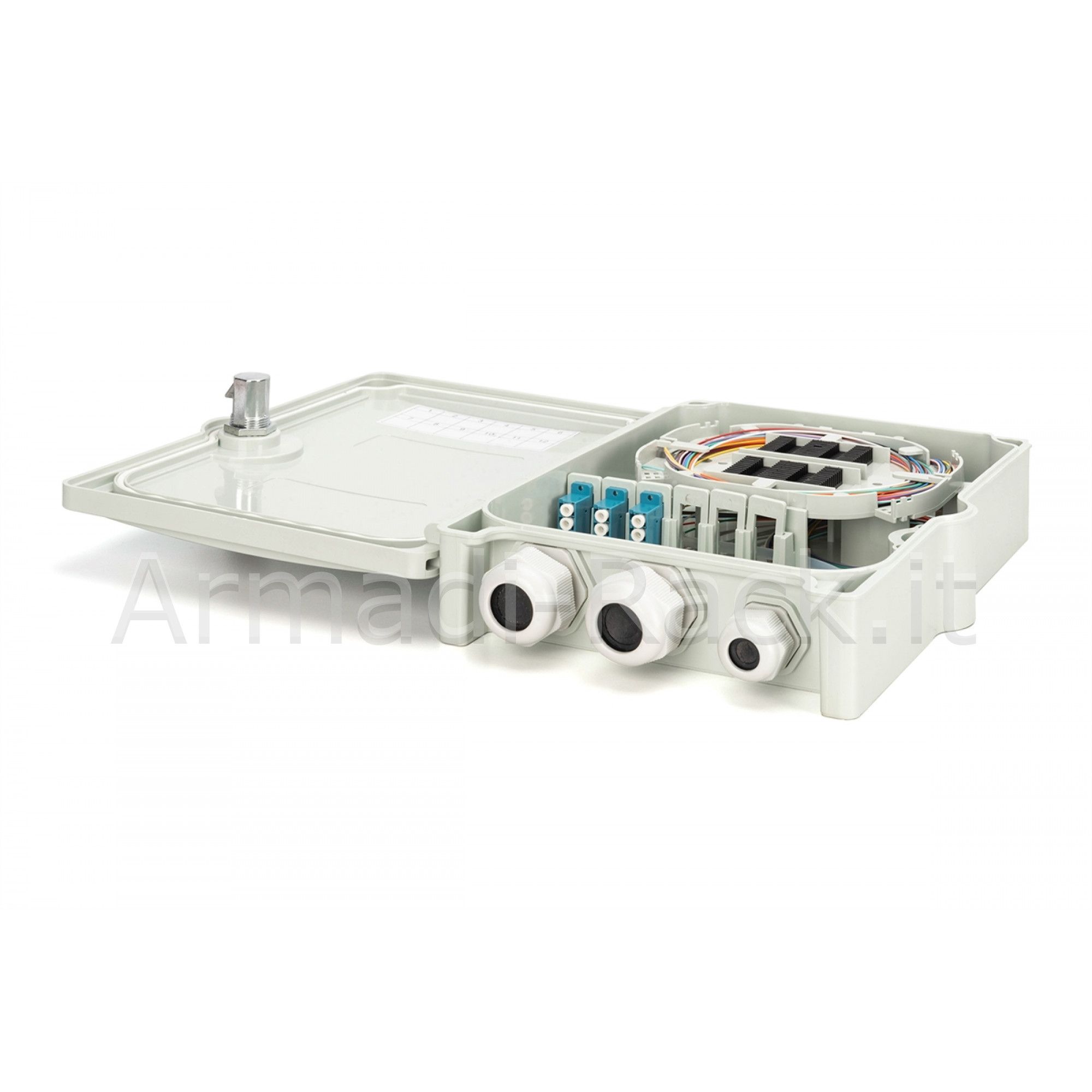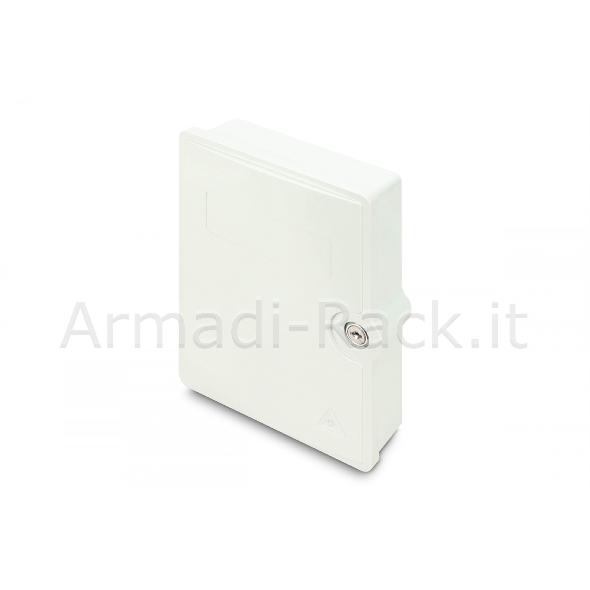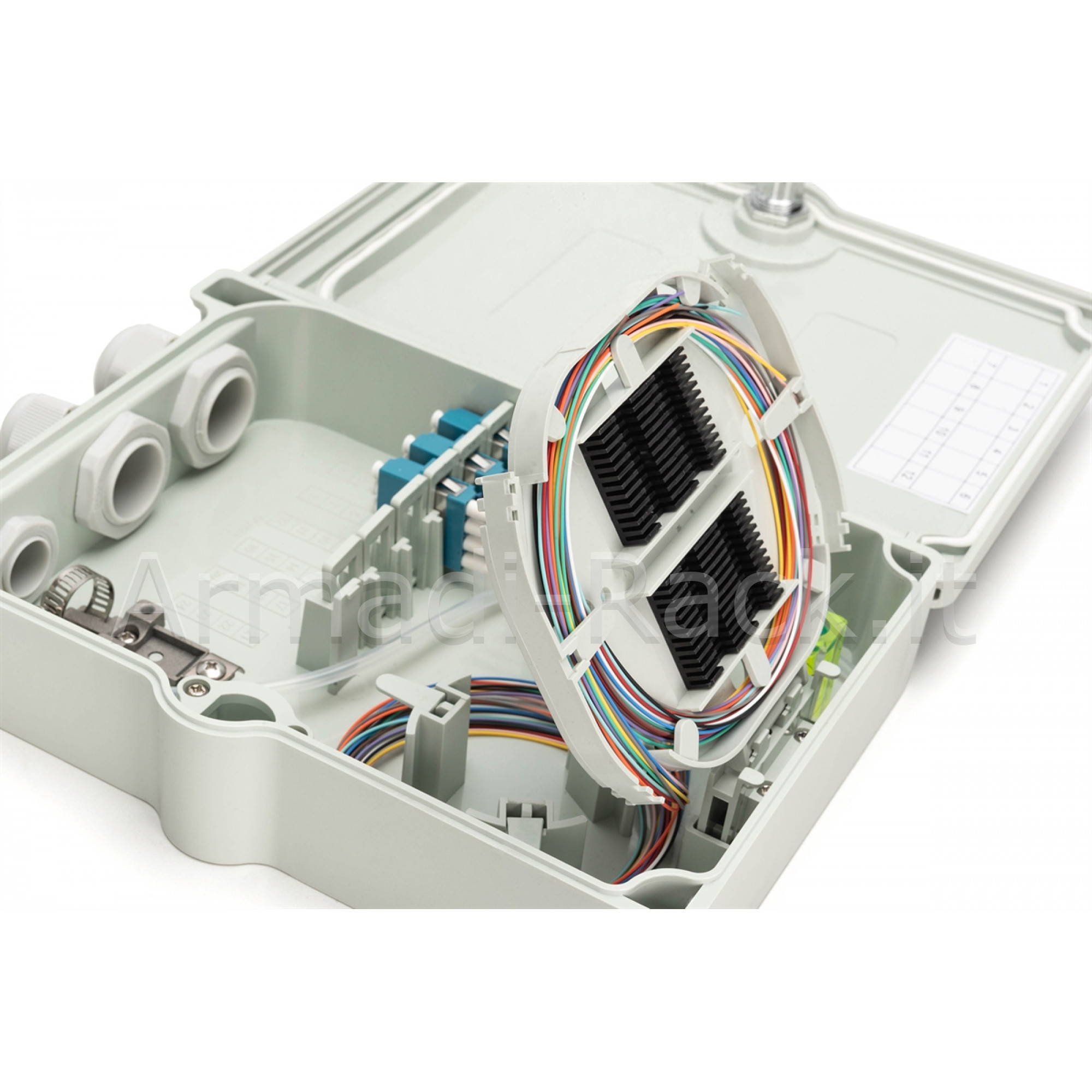 Il box di distribuzione in fibra ottica attrezzato è un alloggiamento speciale progettato per la gestione, la terminazione e la distribuzione dei cavi in fibra ottica ed è particolarmente adatto per le piccole installazioni con un massimo di 12 connessioni in fibra ottica.La scatola può essere utilizzata sia come scatola di distribuzione negli edifici sia come punto di connessione alla casa.La scatola viene fornita preassemblata con tutti i componenti principali come pigtail, adattatori e cassette di giunzione, rendendola una soluzione pronta all'uso che semplifica l'installazione e riduce i tempi di configurazione.Con una capacità fino a 12 connessioni in fibra ottica, è ideale per edifici residenziali, piccole imprese o condomini.I tecnici possono semplicemente giuntare la fibra in ingresso ai pigtail preinstallati, collegare i cavi agli adattatori e montare la scatola nella posizione desiderata.Dettagli tecnici Scatola di connessione in fibra ottica per 12 giunzioni a crimpare, pronta per la giunzione Compresi i pigtail, i portagiunti e gli adattatori 1x set di pigtail LC/PC a 12 colori OS2 G657.A1, LSZH, 0,9 mm 3x Adattatore LC/PC quadruplo con manicotto in ceramica, preassemblato Due supporti di protezione per giunzioni a crimpare da 40 mm Cassetta di giunzione pieghevole, scalabile fino a max 24 pigtail