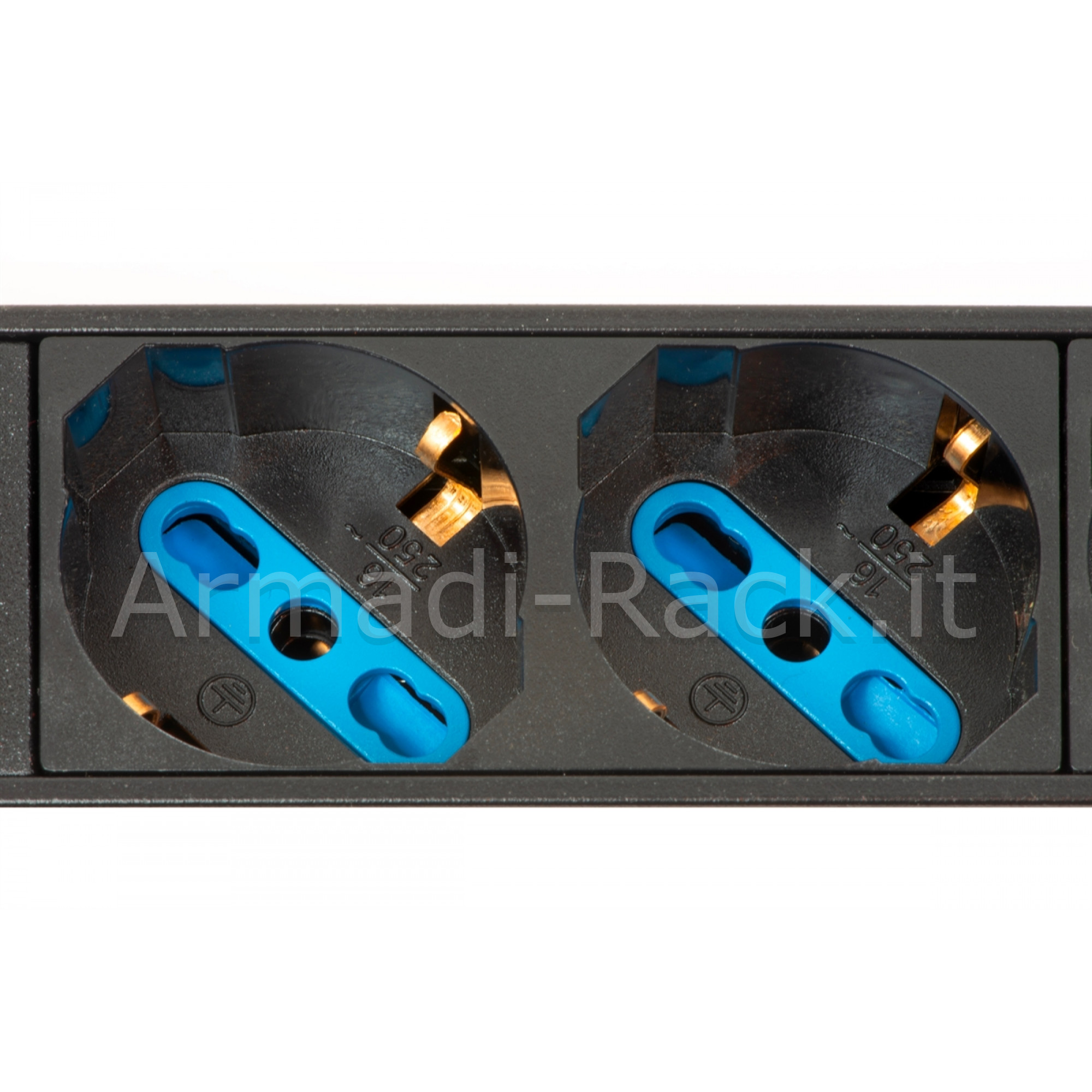 6 prese universali Schuko tedesche e italiane tripolari UNEL 2P+T 16A femmina disposte a 35 gradi