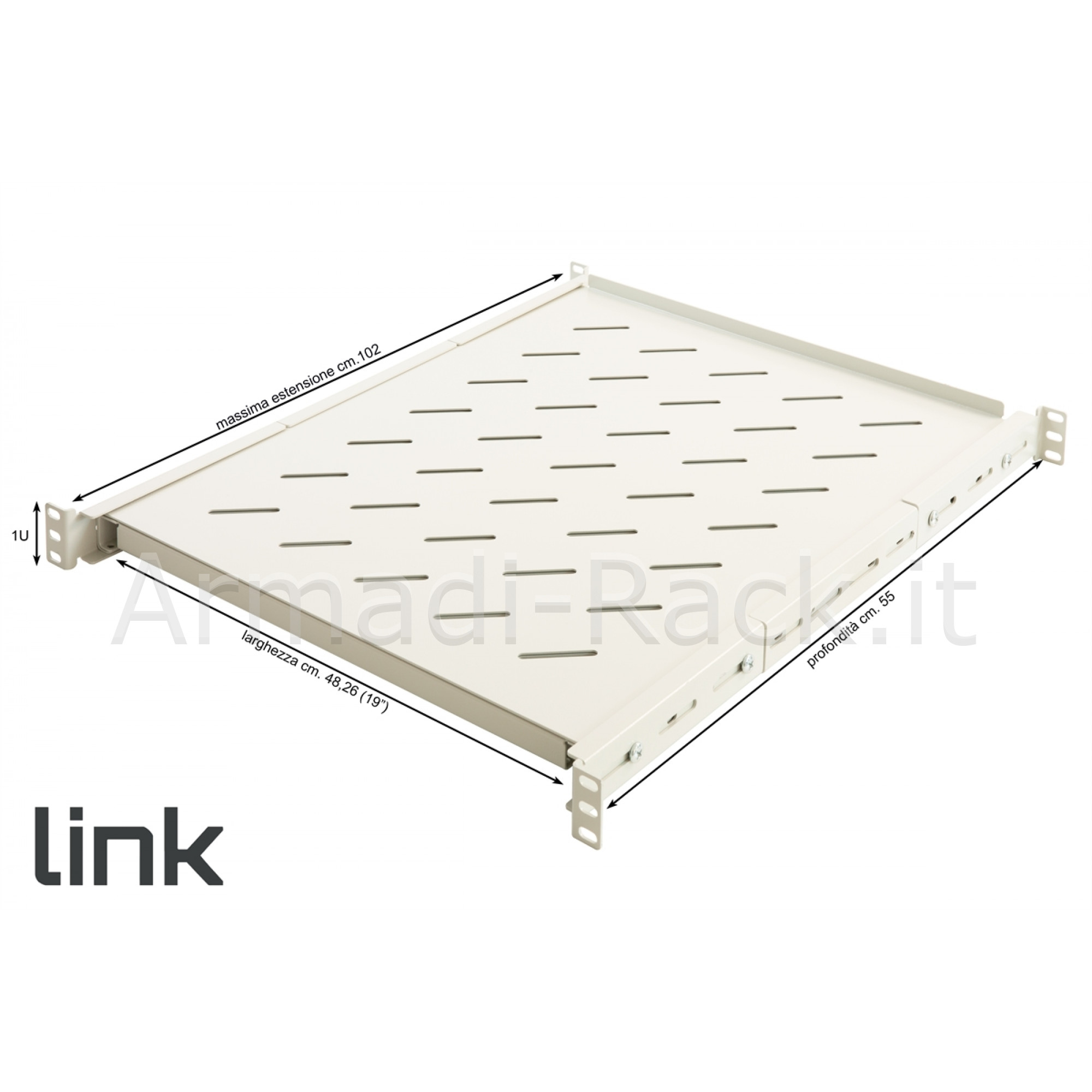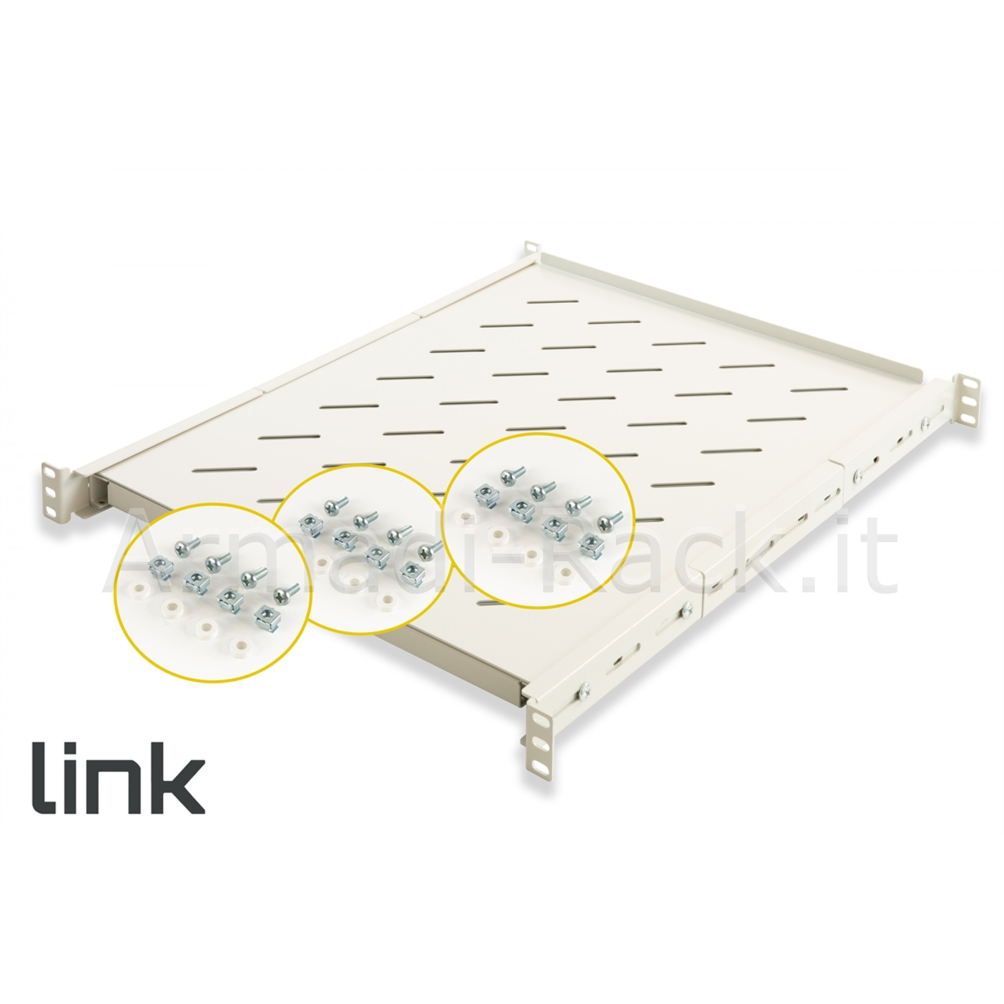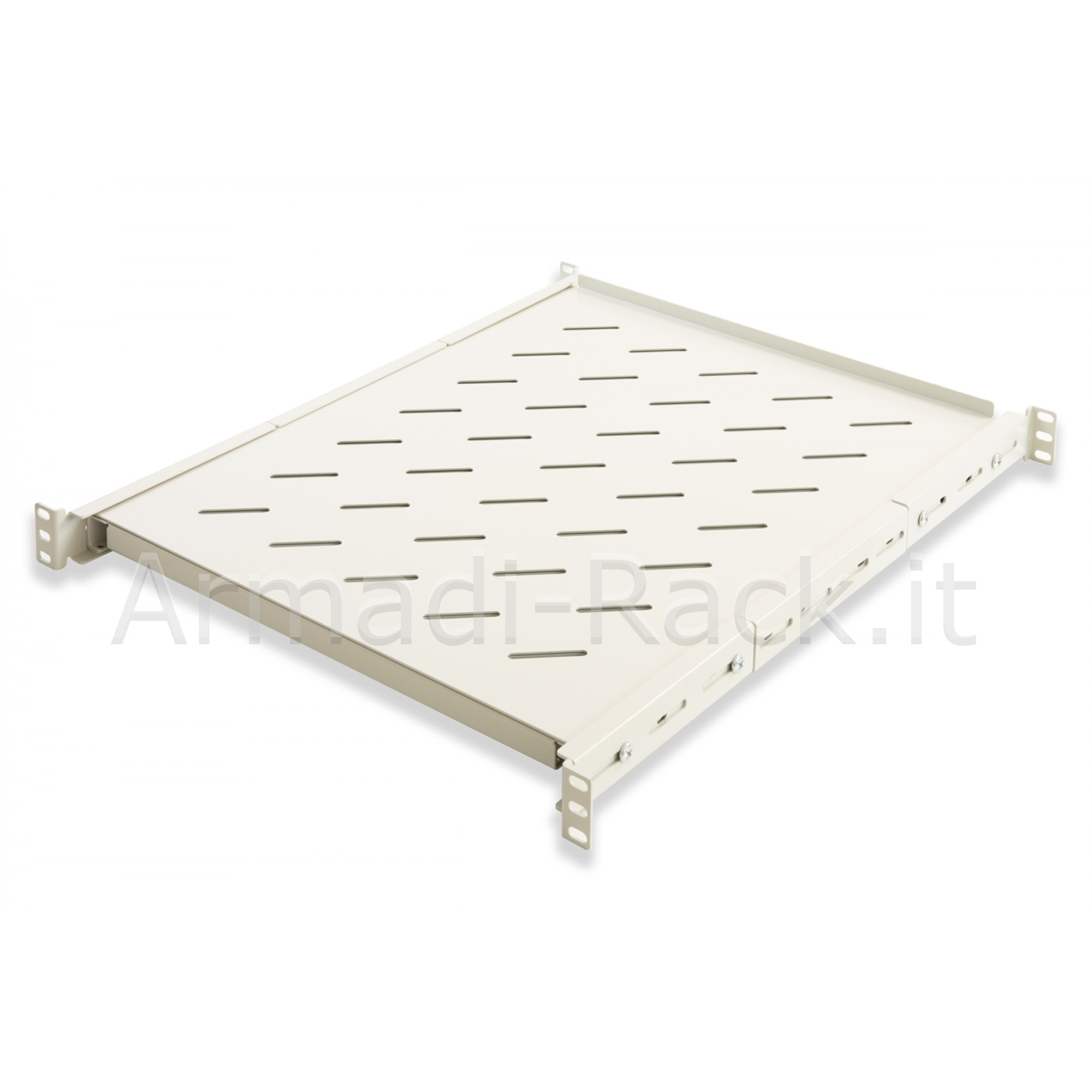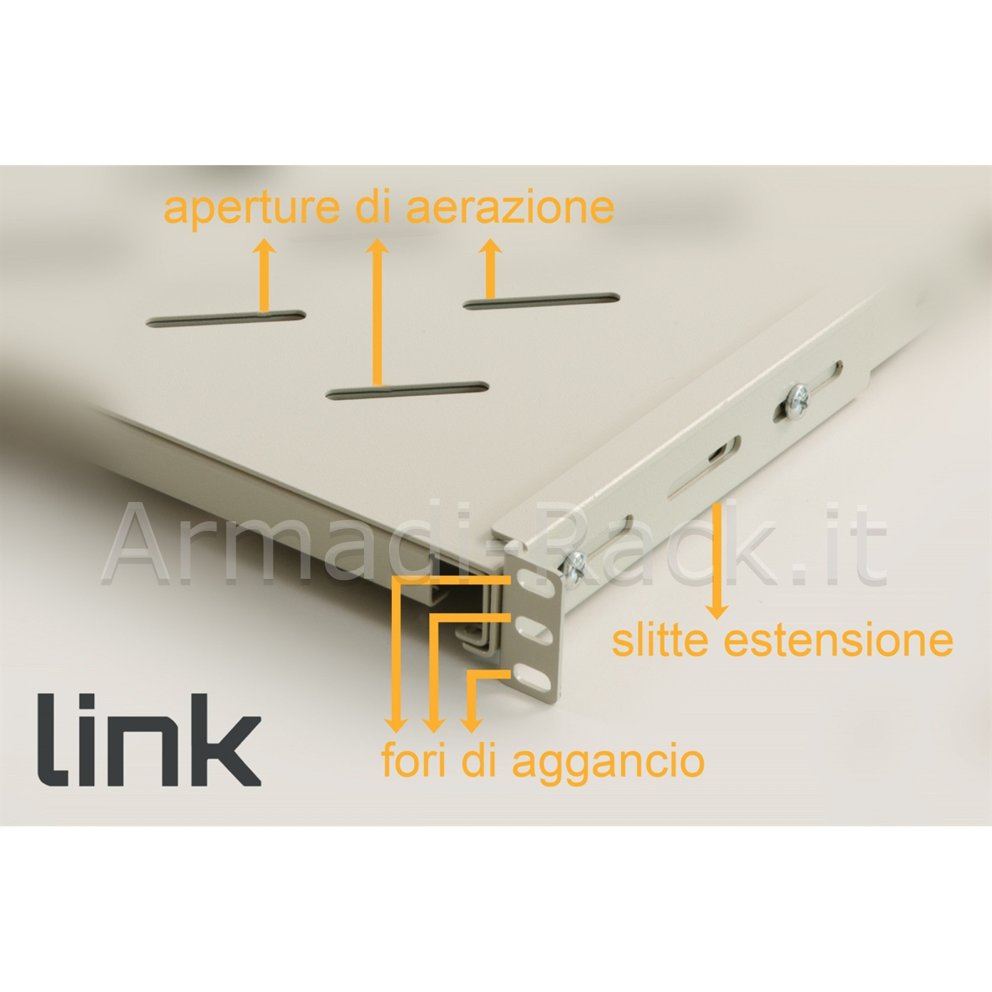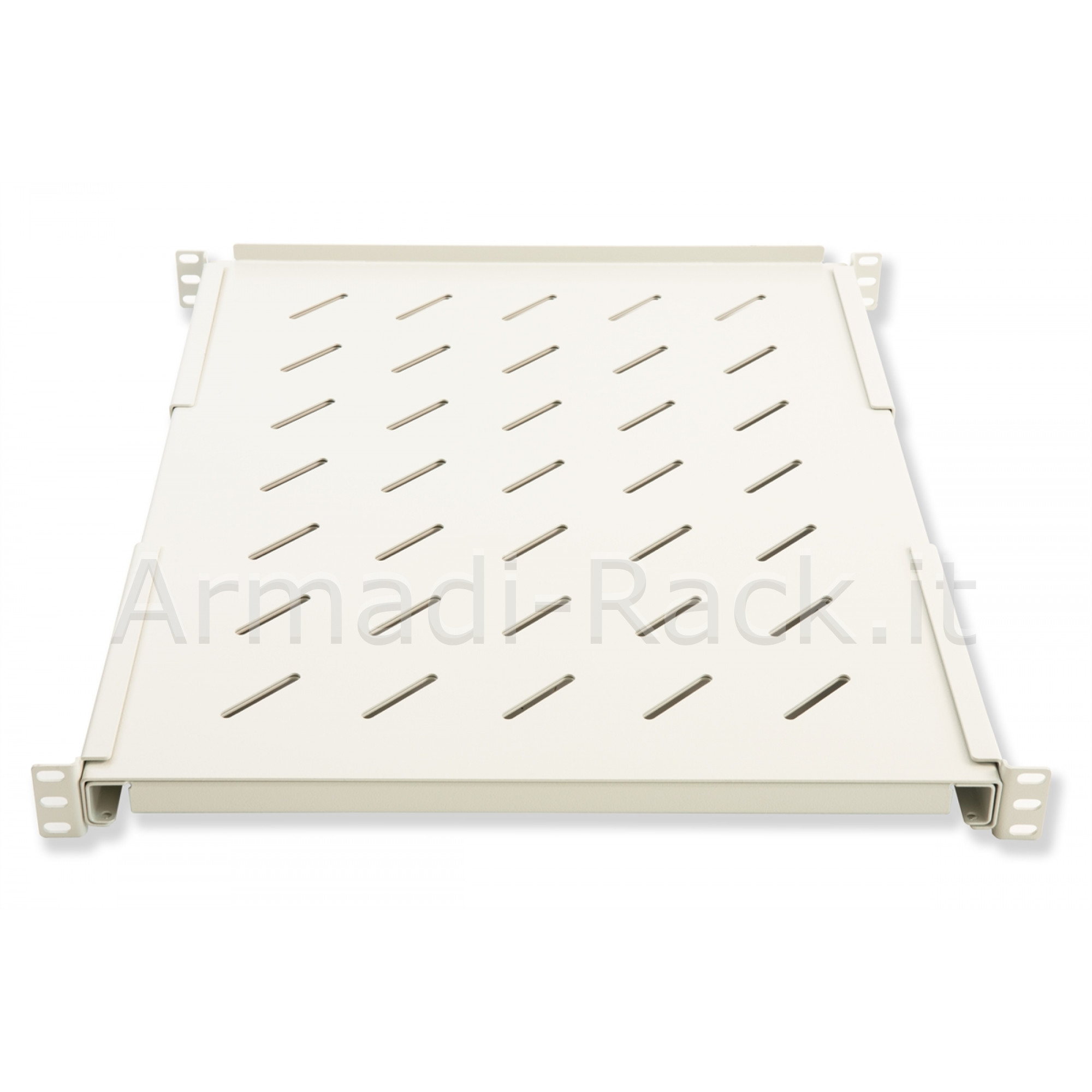 Ripiano fisso universale per armadi rack 19" composto da due superfici sovrapposte e regolabili in più posizione, 4 staffe di fissaggio all'armadio con possibilità di adattarsi ad armadi con distanza tra montanti anteriori e posteriori variabile da 560 a 1023 mm.